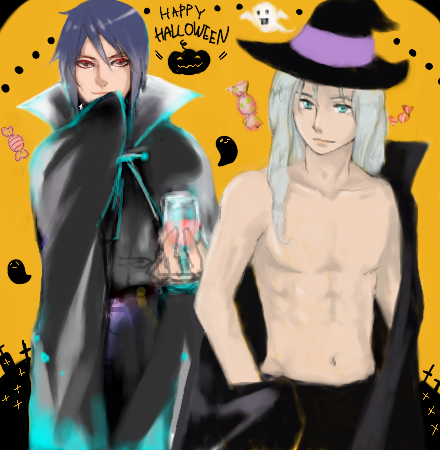 人数居て、ハロウィンお題で一枚完成したのですが、許可取り損じたので、空間開いてるけど、ハリさんなら許可もらえそう~と快諾いただき、しかも二人の間の白い隙間まで埋めて、綺麗なハロウィン絵に仕上げてくれるとか…!素晴らしさに感激ですv