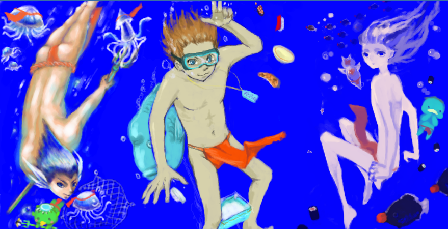 ふんどし描こうぜって話になって、この青で画面塗りつぶしたら、泳いでる絵で描こうって話になって、気づけば…