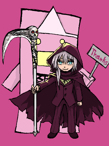 マントのぶわっと感がいまひとつ決まってない気がして、線画投稿諦めじゃーと、描いてる時思ったんですが、ふと久しぶりに塗る前の死神くんの絵を見たら、爽やかフェイスだったので、誰かの需要になればーと思い直して投稿してみました。