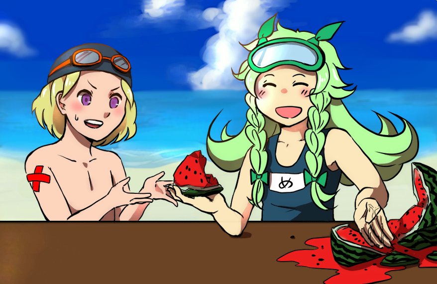 夏のアイコン同士ということで、もげぴこさんのオリキャラのメイガスちゃんにスイカを振舞ってもらっているというw汗w