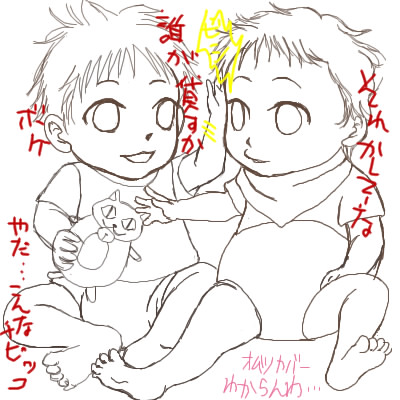 遡ること2008年の8月、VS子供チームに何かネタはないものかとむっちむちを模索してて出た絵だったんですが、何となくシチュに煮詰まってそれきりになってました。