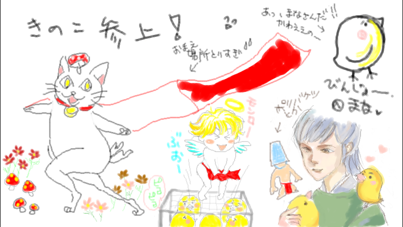 私が入ったら会話のログはなかったので、まずぎんの字さんがきのこネコさんを描いて、それからまなさんがピヨちゃん描いていったのかなと想像です。