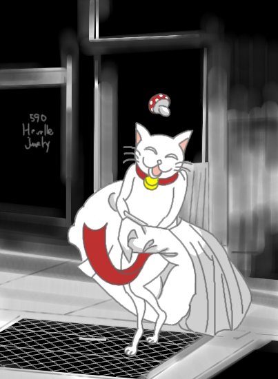 いつも基本裸なきのこネコさんが、スカートをはいて、さらに例のものをはためかしているという(笑)