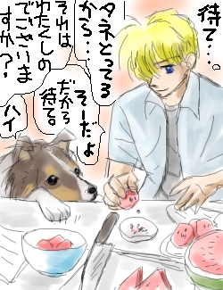 ↓六郎からの暑中見舞いスイカを切り分けるやさしいベンさん。ふしょーさん作。