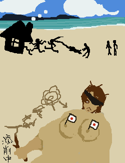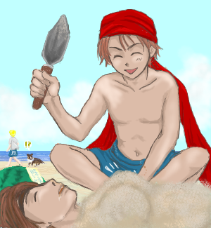 パンツを浜辺に置いたまま、バカンスお決まりのコースである砂に埋もれてのお昼寝タイム中の山田君発見。