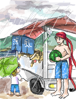 にわか雨の降る中、和やかな風景であります。
