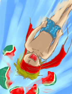 このネタ絵に、その後、飛び散ったスイカの欠片をとるべく、