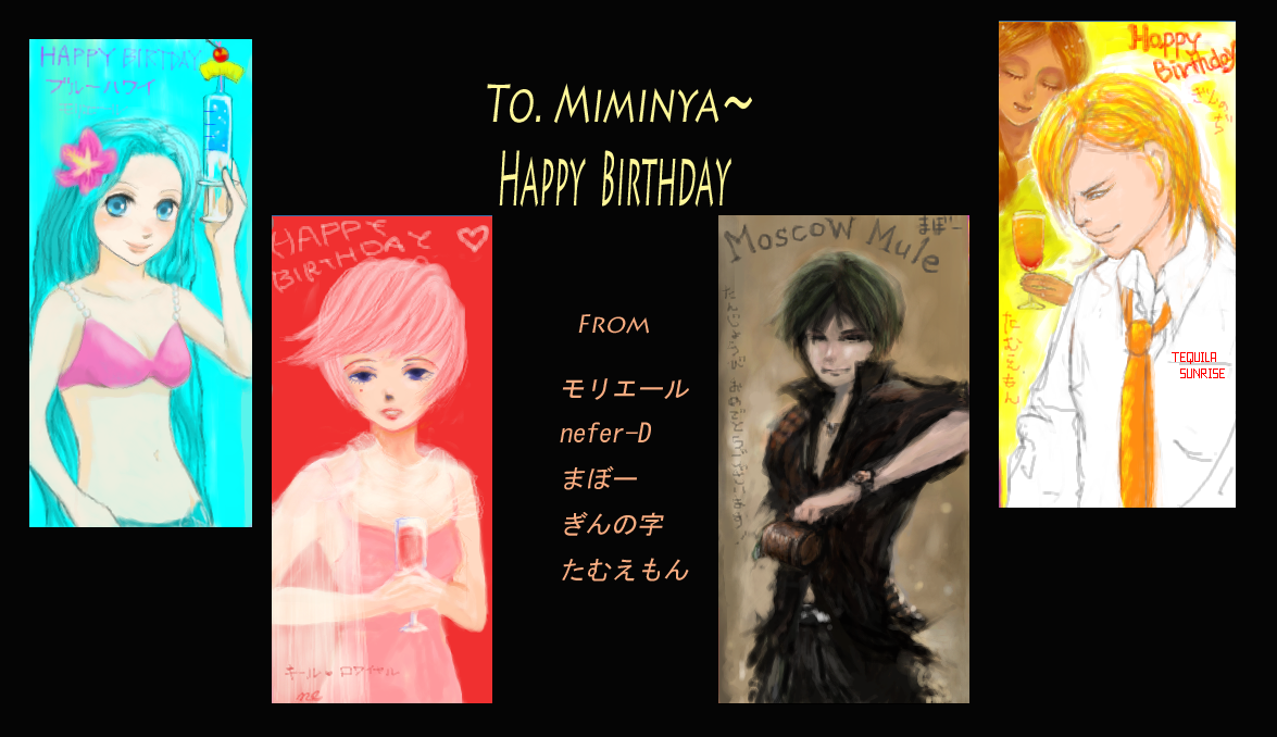 ゆうべですが、ねふぁさんが、ミミニャ~さんのお誕生日祝いに、絵チャを企画されてて、埋まってなかったら、描いていこうと思って覗いてみたら、ねふぁさんとぎんの字さんが入室してるのがわかって入った次第です。