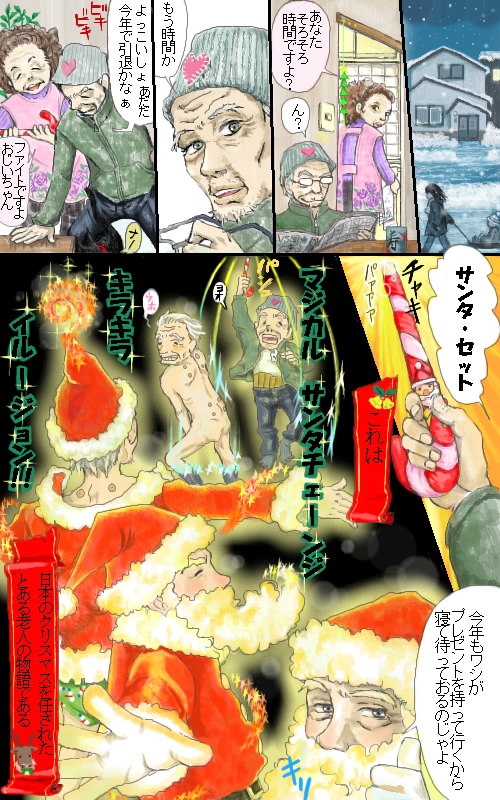 寒い中、苦労してプレゼントを配っていく話なんですが、そんなリアリティある感じのサンタになればーと思って、どうせなら、どこにでもいそうな普通に暮してる日本のおじいちゃんで行こう→どうせなら変身シーンで描こう。に大きくシフトして、この絵はこうなったのでした(笑) ほら、ページの尺ってものもあるし@@;