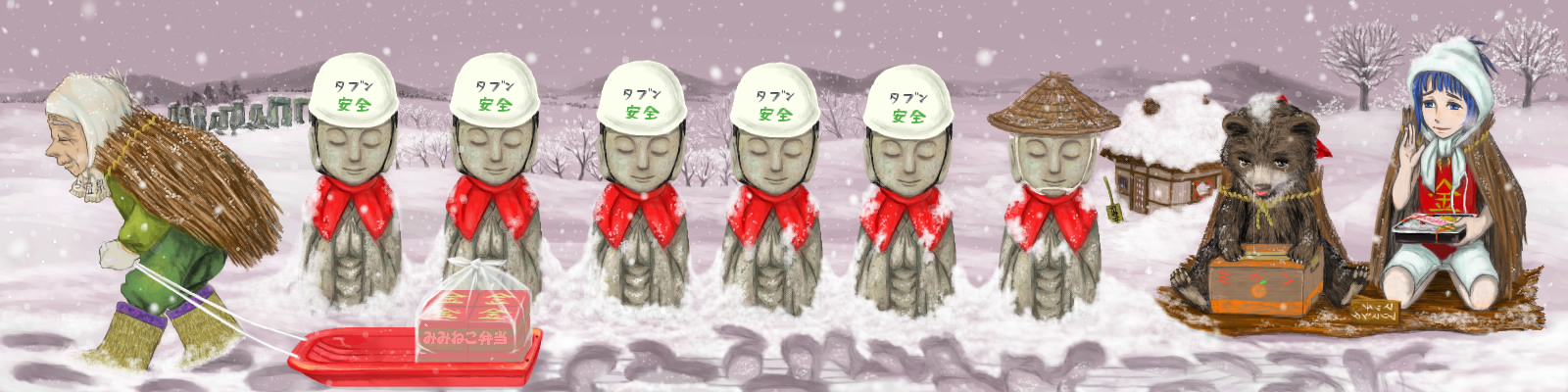 妻とヘルメット工場を細々と営んでいる田分さん(75歳)は、村はずれにあるお地蔵さまがあまりにも寒そうなため、売れ残ったヘルメットと自分の菅笠を与えるのでした。