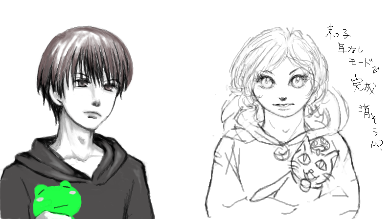 拡大して髪の毛仕上げていたものだから、元のサイズに戻すたびに、ぎんの字さんの絵が変わってて、その前に私も全消しを数回やってるくらい難儀してたんで、おおお、同じく苦心してる、と見てました。