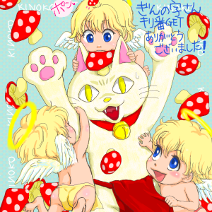 ぎんの字さんからのリクエストは、きのこネコさんを天使ちゃんでむっちむちにしてくれ、ということだったんですけど、むっちむちというより、よってたかってあくどいことをしてるような風合いです^^;